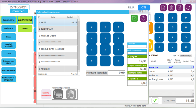 Validation du paiement avec combinaison multiple possible de moyen de paiement (la sélection du champ "Montant" d'un type de paiement prérempli le montant total du ticket) :
