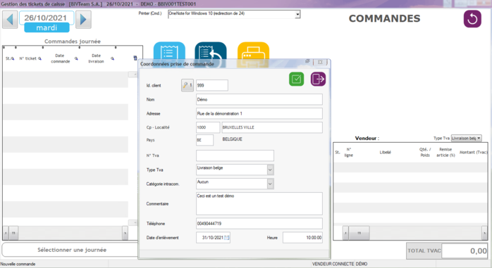 Création d'une nouvelle commande par l'encodage ou la saisie d'un client dans la fenêtre de saisie des coordonnées de la prise de commande :