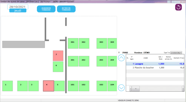 Les tables en vert sont disponibles pour l'encodage d'un ticket.